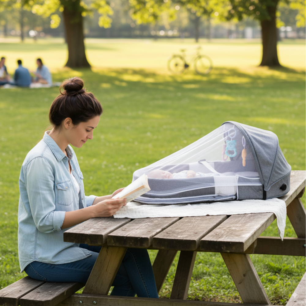 ☀️ Sunlight Protection – Breathable net keeps baby cool.