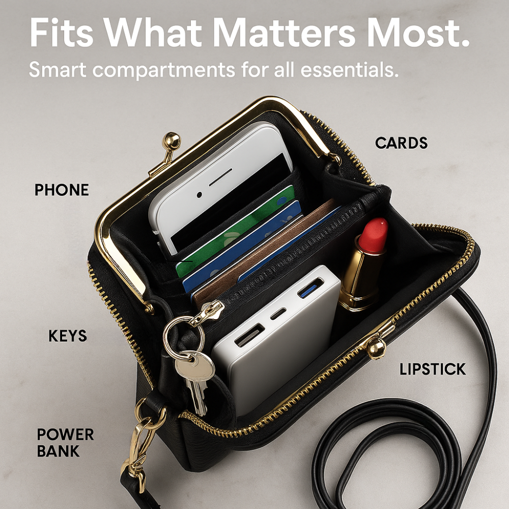 The Lustré CrossBody Bag keeps your phone, cards, keys, and cash right where you need them secure, stylish, and effortlessly accessible.